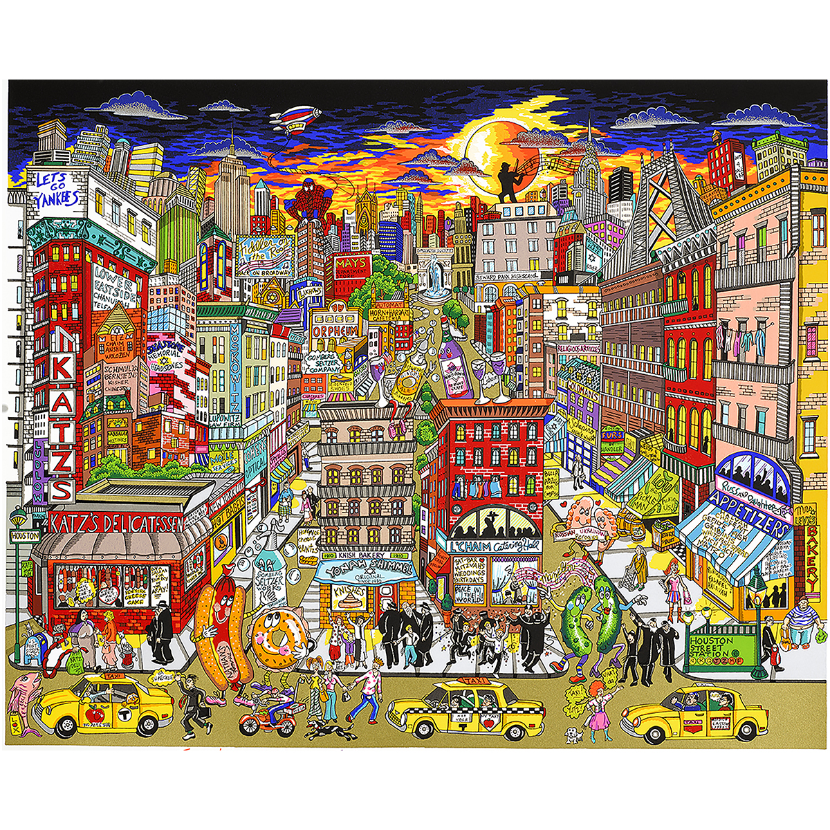 Charles Fazzino’s works are composed of 3 silkscreens cut manually with a cutter. Each piece is then glued back together by hand. By playing with the height of the glue dots and slightly off-center the different pieces, the artist accentuates the 3D effect. The painting is then decorated with glitters and Swarovski crystals before being numbered and signed by hand.